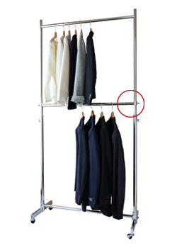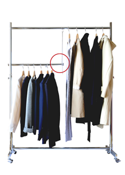 ハンガーラックの半分だけを2段にできるチェーン式2段バー。長いコートとシャツを一緒にかけることも。伸縮式。