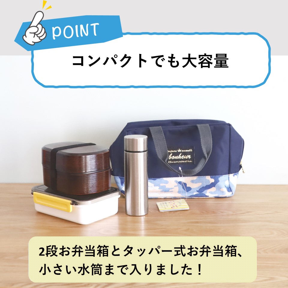 実際に入れているのは、2段のお弁当箱と1段のお弁当箱、そしてミニ水筒です。 お弁当の量としては十分です。 ちょっとしたワンちゃんのお散歩にも便利なサイズです。