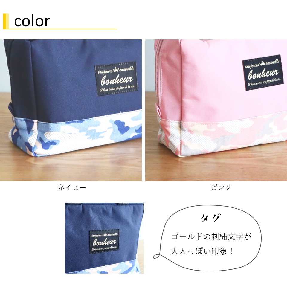 アクセントの迷彩柄。迷彩柄とゴールドの文字、ゴールドのファスナーが大人っぽくアクセントになっています。