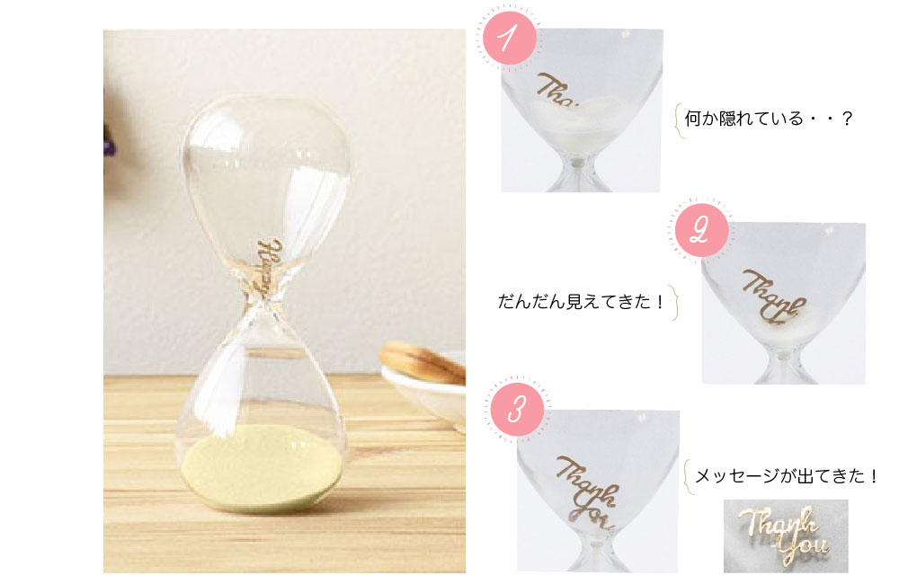 落ちる砂の中から徐々にメッセージが現れるギフト感あふれる3分砂時計