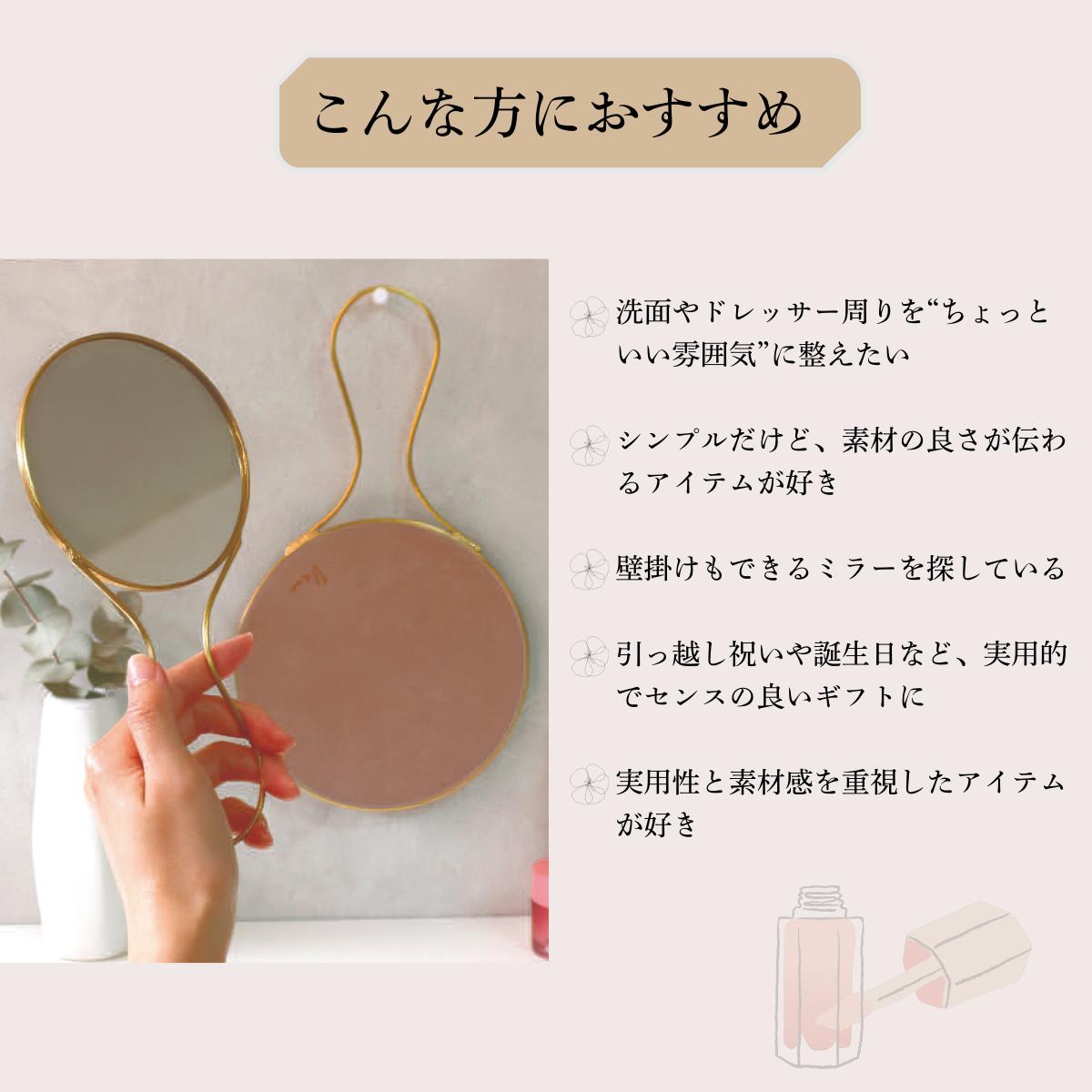 身支度スペースをすっきり整えたい方におすすめ。ハンドミラーとしても、吊るしてウォールミラーとしても。場所を選ばず使えます。